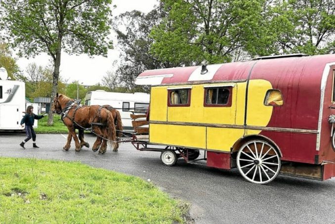 C’est le quotidien Le Télégramme qui relate cet événement insolite. Dans l'édition datée du 1er mai, notre confrère du journal breton raconte, image à l’appui, avoir croisé vendredi 28 avril une « roulotte tirée par deux chevaux de trait » sur l’aire de camping-cars de Gouarec, sur la commune de Plélauff, dans les Côtes-d’Armor.