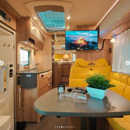 Extérieurement, c’est d’une couleur « chinabule » que se pare ce motorhome. Très stylisé à l’avant avec des rayures noires, qui lui donne une allure féline, les côtés arrières sont illustrés de montagnes. Une belle allure sportive et élégante entre le bleu et le noir !
