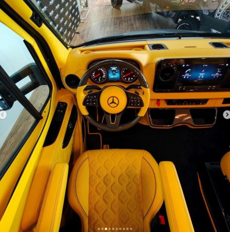 A l’intérieur, il faut le dire, c’est clinquant et tout à fait inédit. C’est le jaune qui saute au yeux et qui pare l’intégralité de la cellule. En reprenant les couleurs d’une abeille, des détails en noirs sont soulignés (accoudoirs des sièges avants, volants, appareil de navigation, éléments de portière, etc.).