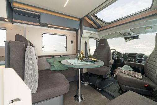 Le salon des Kosmo L peut recevoir jusqu’à 5 personnes avec banquette en L et siège d’appoint en plus des sièges de cabine ou banquettes face-face. Tandis que les intégraux Kosmo H sont tous deux agencés avec une banquette en L, un siège d’appoint et les deux de cabine.