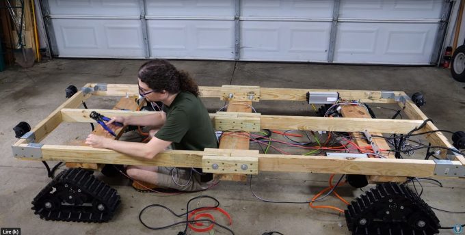 Le camping-car conçu par notre youtubeur de génie est construit à partir d’un châssis en bois. Les roues à chenilles sont animées par une chaîne entraînée par un moteur électrique. La vitesse moyenne reste basse et on ne sait trop rien de l’autonomie. Toutefois, au vue de la capacité de la batterie embarquée (100 Ah) elle doit être relativement importante. A la place du volant, en gamer averti, Quiet Nerd a préféré un joystick fabriqué de toutes pièces par ses soins.