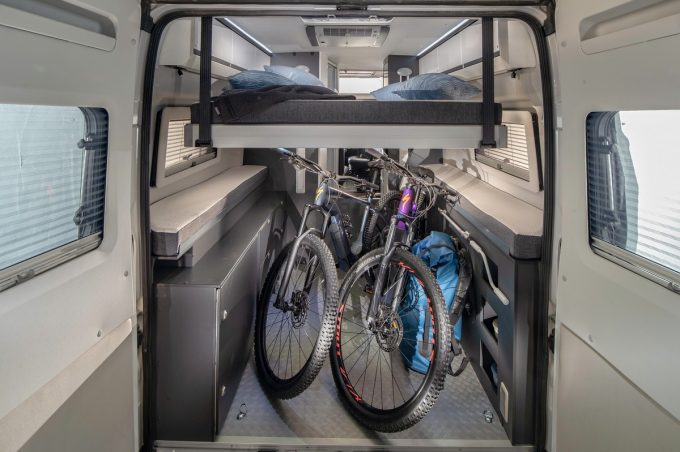 Démocratisé avec l’arrivée, en 2019, de l’Adria 640 SGX (pratiquement tous les constructeurs en proposent dorénavant), le fourgon à lit de pavillon électrique sur soute s’est immédiatement forgé une image de partenaire idéal pour les sportifs. Ce couchage à géométrie variable permet en effet de transformer la chambre en garage. Idéal pour les deux-roues.