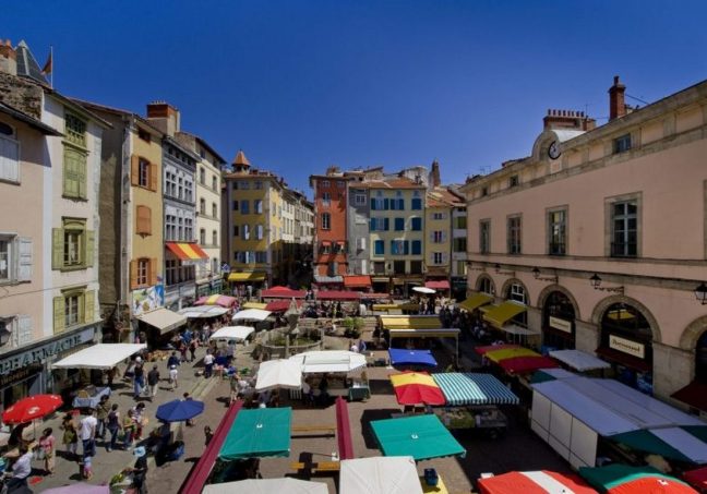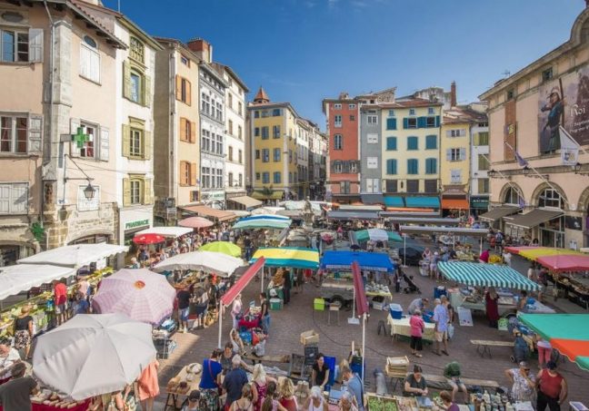 C’est une petite ville dans la ville, chaque samedi matin. Sur la place du Plot, entre des immeubles de quelques étages aux volets orange, jaune, bleu marine ou bleu clair, ce qui lui confère une ambiance unique, le marché du Puy-en-Velay est d’abord un lieu de rencontre. Entre les habitants de la ville, d’une part, qui aiment se retrouver pour échanger sur les banalités de la vie ou les dernières informations, mais aussi entre les amoureux des belles choses et des producteurs au savoir-faire qui n’est plus à démontrer, de l’autre. Avec, sur les étals, quelques pépites, comme les fameuses lentilles vertes du Puy et des petites créations bien locales, à l’image d’un apéritif particulier, issu de la macération de cerises, d’amandes douces et de quinquina, une écorce d’un arbuste d’Amérique du Sud, le tout dans du vin nommé le Maurin. Mais au Puy, le marché a aussi sa tête de gondole : le fromage aux artisous, typique de la région, produit à partir de lait cru de vache et dont la fabrication est quelque peu spéciale. La raison ? Après lui avoir donné sa forme, l’avoir égoutté et asséché mais aussi salé, des acariens, qu’on appelle donc des artisous, vont en effet être appliqués lors de l’affinage. Le but ? Qu’ils se développent et sculptent la croûte, tout en apportant la saveur typique de ce fromage. Miam !