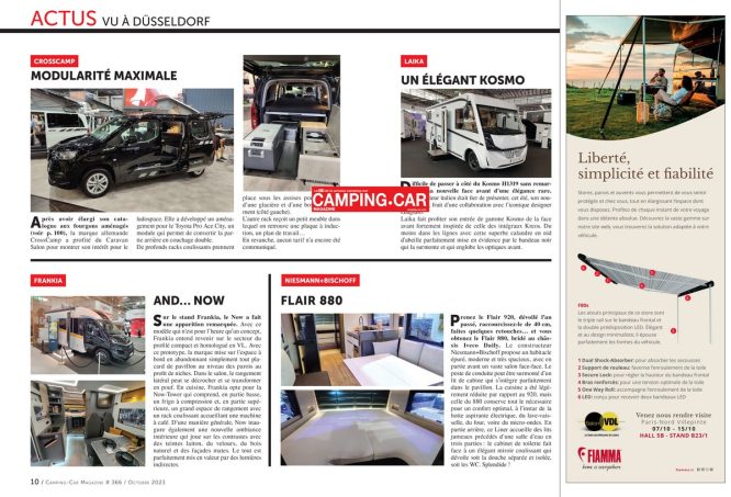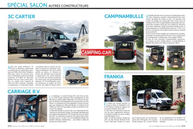 En exclusivité, 70 essais de véhicules sont présentés. Un tour d’horizon des marques existantes sur le marché se glisse également parmi les pages. Profilés, intégraux, fourgons, vans et capucines, toutes les implantations sont là, il y en a pour tous les goûts et tous les budgets. Et c’est bien évidemment la période des salons, ici on vous propose un débrief de celui de Düsseldorf. Le prochain salon VDL sera celui de Villepinte qui se tiendra le mois prochain (du 07 au 15 octobre). Un guide d’achat vous aiguille avec 1700 véhicules dont les dimensions, le poids, l’autonomie et surtout les tarifs sont renseignés.