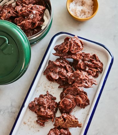 Parsemez un peu de fleur de sel puis réfrigérez 30 mn au moins, pour que le chocolat fige. Conservez dans une boîte avant de déguster.