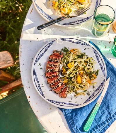 Dans un bol, mélangez tous les ingrédients de la marinade. Coupez les filets de saumon en deux dans la longueur. Déposez-les dans la marinade, enrobez et réservez au frais 30 mn à 1 heure. Pendant ce temps, émincez finement le fenouil au couteau ou à la mandoline, et trempez-les dans de l’eau froide pour qu’ils deviennent croquants.