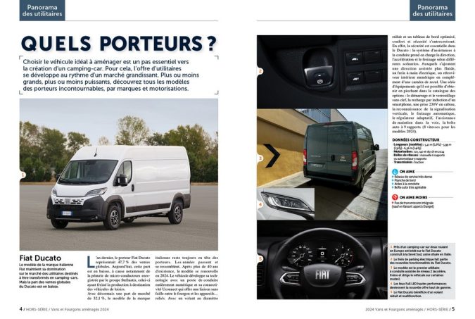 - Un panorama des utilitaires avec les différents porteurs : Fiat Ducato, Citroën Jumper, Ford Transit, Mercedes Sprinter, Renault Master, Volkswagen Crafter, Citroen Jumpy, etc.
