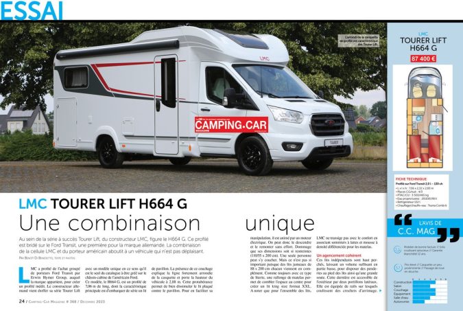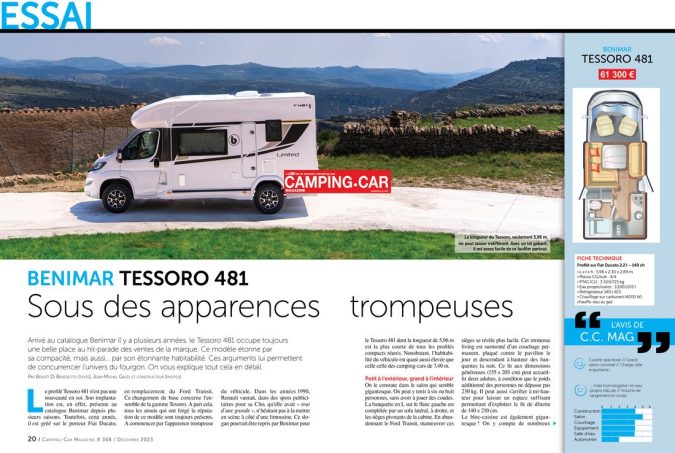 Enfin, quatre modèles de camping-cars sont à l’essai ce mois-ci : le Pilote Atlas A656D, le Benimar Tessoro 481, le LMC Tourer Lift H664 G, le Campérêve Miramar 61.