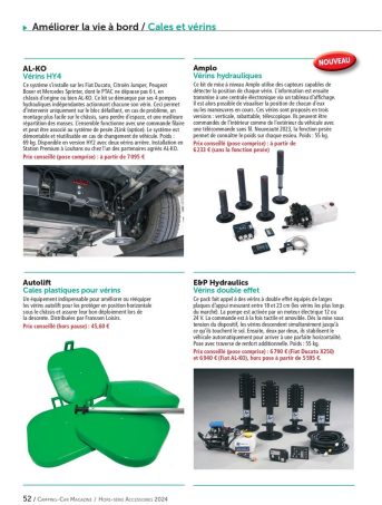 Que ce soit pour un nouvel adepte du camping-car ou un pratiquant depuis toujours, les accessoires plaisent puisqu’ils permettent de venir personnaliser son véhicule ! Pour le divertissement, les activités outdoor, renforcer la sécurité, profiter des extérieurs, ou tout simplement améliorer la vie à bord, les accessoires sont nombreux sur le marché. Le guide d’achat Camping-Car Magazine vous propose de découvrir 420 produits présentés en détail dont 140 nouveautés.