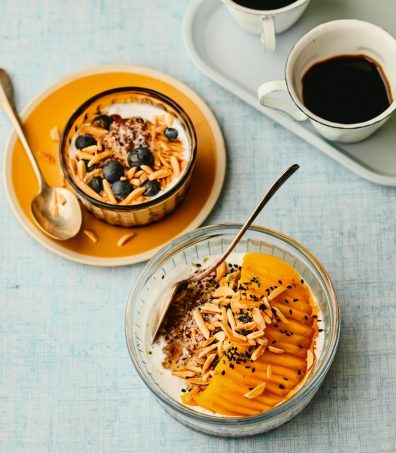 Déposez les fruits sur le porridge, ajoutez quelques amandes dorées à la poêle, des graines de sésame et un filet de sirop d’érable. Dégustez rapidement.