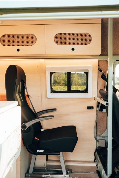 En partie arrière, ForNomad a intégré un sofa qui fait office de banquette pour le salon. L'élément se transforme en couchage "double" de 120 x 190 cm environ, grâce à un sommier type peigne et au dossier d'assise qui sert de matelas additionnel. Et pour l'enfant ? ForNomad a opté pour un hamac amovible de che Beizh Trotter (encore du 100% français) qui vient se positionner sur les sièges de l'Estafette. Pratique et peu encombrant une fois rangée !