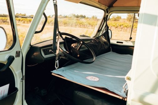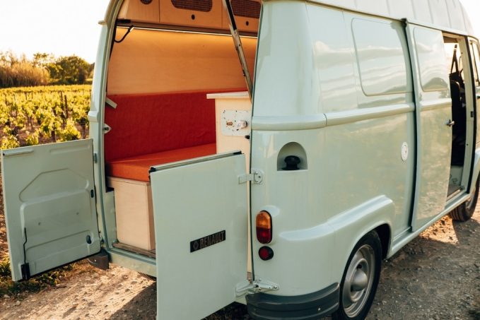 Si esthétiquement la Renault Estafette a "de la gueule", l'aménager est une tout autre affaire, en raison de l'étroitesse de la caisse. ForNomad a donc opté pour une cuisine fixe dotée d'un réchaud à gaz à un feu, d'un évier avec de l'eau et d'un petit frigo à compression de 50 l. Côté autonomie, la fourgonnette embarque des réserves de 60 l d'eau propre et environ 40 l d'eaux usées. Dans une démarche éco-responsable, l'aménageur utilise du peuplier pour le contreplaqué, et opte pour une surface de plan de travail de la société LePavé -support obtenu à partir de déchets plastiques recyclés. Le coloris Floréal apporte une touche de gaieté et de modernité, contraste avec le peuplier et s'harmonise élégamment avec le sol en vinyle effet béton.