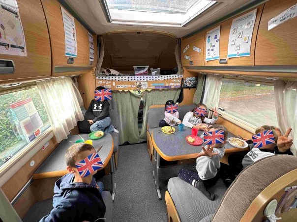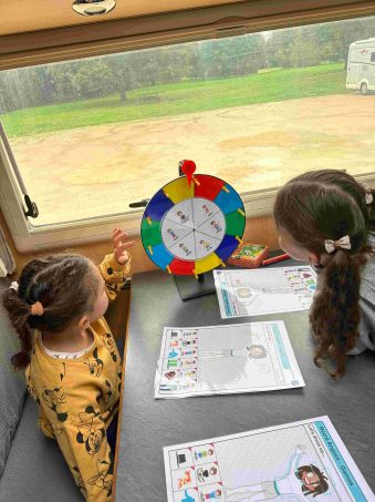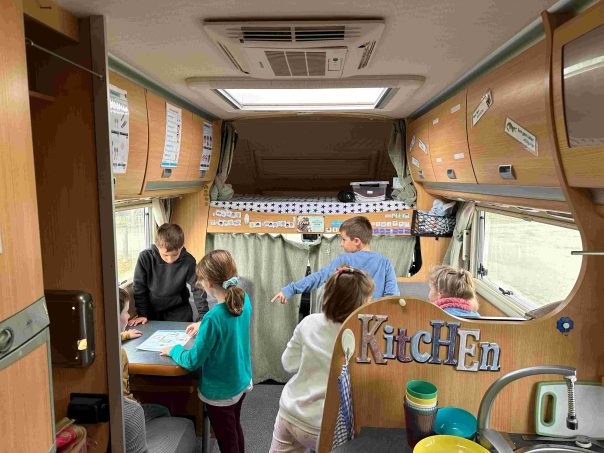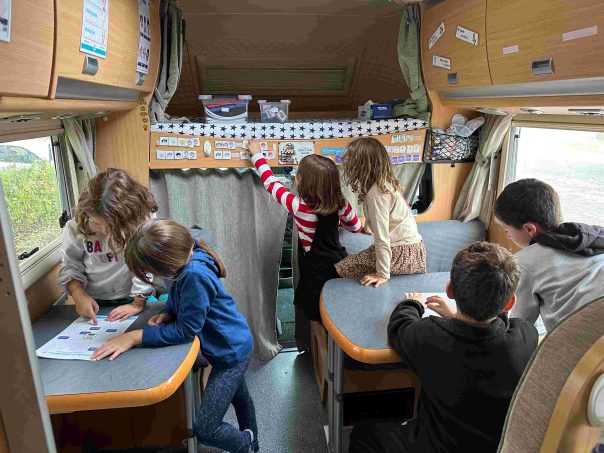 « Alors à notre retour, j’ai eu envie de donner des cours d’anglais dans le camping-car, même si on continue à voyager avec en famille », rappelle Fiona Rowlatt. Ainsi, elle accueille les enfants par groupes de six et prépare à manger chez elle en amont. Il y a suffisamment de place pour accueillir tout le monde autour de la table et les placards sont remplis de jeux et autres activités pour apprendre la langue.