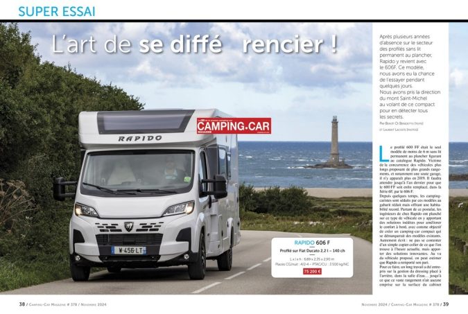Le Super Essai de ce mois-ci nous a conduit dans la Baie du Mont-Saint-Michel au volant du Rapido 606F, un profilé de moins de 6,70 m avec une implantation sans lit au plancher. Mais pour faire face à la concurrence, la marque s'est montrée inventive en développant un espace de rangement inédit et ingénieux.