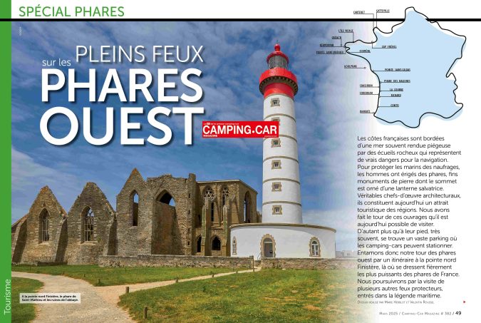 Le dossier touristique phare de ce numéro est dédié… Aux phares. Outre ce jeu de mots léger, nous revenons à travers une vingtaine de pages sur ces édifices qui bordent les côtes françaises. Construits pour protéger les marins des naufrages, ces monuments de pierre sont de véritables chefs-d’œuvre architecturaux qui constituent un attrait touristique. À proximité se trouvent souvent de vastes parkings où les camping-caristes peuvent stationner. Nous vous emmenons en visiter quelques-uns.