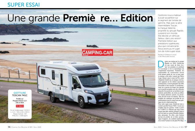 Ce mois-ci le super essai s’intéresse au profilé de la marque Giottiline Toscan 74GC. Avec ce camping-car, le constructeur sort de sa zone de confort, en proposant non pas une entrée de gamme, mais un véhicule aux prestations supérieures. Dans ce super essai, nous verrons si la marque gagne son pari.