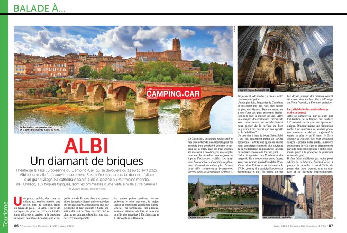 Albi accueillera la Fête Européenne du Camping-Car du 11 au 13 avril. C’est donc l’occasion pour tous les camping-caristes de découvrir la préfecture du Tarn. Cette petite ville aux allures de grand village est réputée pour sa cité épiscopale située en centre-ville. Notons qu’elle abrite également la cathédrale Sainte-Cécile, classée au Patrimoine mondial de l’Unesco.