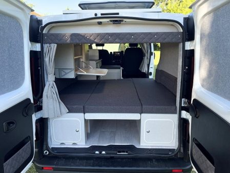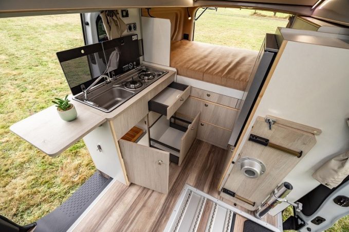 Parmi ces derniers, se trouve l’Equinox, disponible actuellement sur Renault Trafic (en attendant une version sur le nouveau Volkswagen Transporter) qui, vous vous en doutez, présente un agencement articulé autour d’un lit arrière permanent. Grâce à des extensions de carrosserie, installées sur le haut des panneaux arrière, le couchage affiche des dimensions de 130 x 190 cm. Plusieurs configurations sont proposées selon le nombre de passagers : deux, trois ou quatre personnes. Elles sont respectivement dénommées Equinox II, III et IV. Le premier s’articule autour d’un meuble cuisine avec rangements logé contre la paroi gauche, tandis que le réfrigérateur prend place à l’opposé, dans une colonne. À côté, le coffre qui fait office de siège d’appoint cache les WC. Enfin, une douche peut être installée entre les deux meubles.