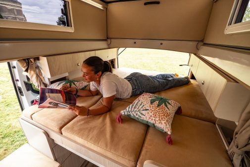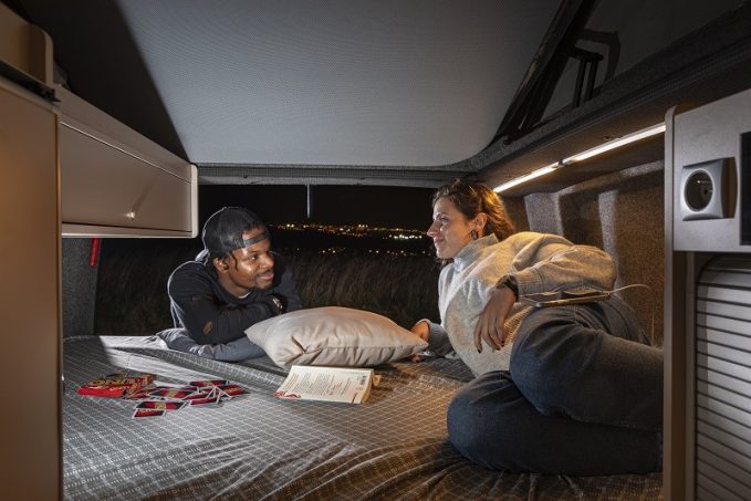 L’aménageur de Cholet propose une gamme majoritairement constituée de vans à lit permanent. Cette dernière est scindée en deux propositions, les V7, équipés du fameux toit relevable à parois rigides isolées qui a fait pour partie la renommée de la marque, et les nouveaux V6 qui, eux, sont équipés d’un toit relevable à parois toiles plus classique, mais également de fabrication maison.
