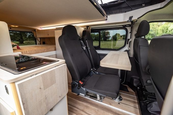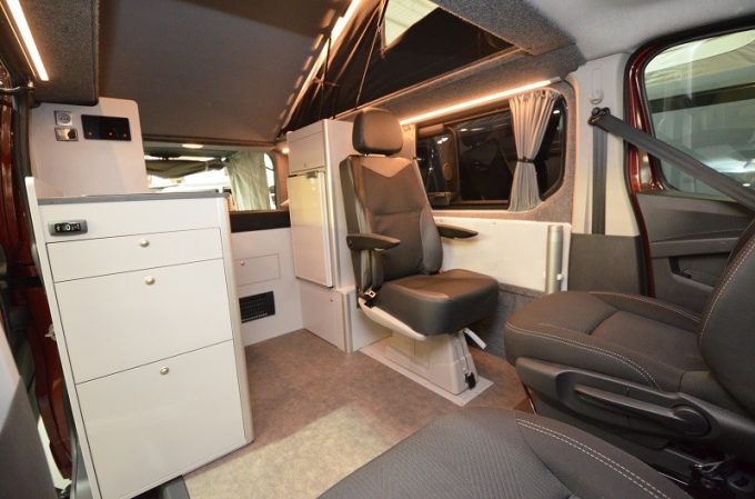Il suffit pour cela de mettre en place une “chaussette” en PVC, incluant le receveur qui se connecte à une bonde dans le plancher. Enfin, un grand toit relevable permet de se tenir debout à bord. Les déclinaisons III et IV conservent la même chambre, mais reposent sur une implantation différente à l’avant. Ici, la cuisine trouve sa place à l’aplomb de la porte d’entrée tandis que le réfrigérateur migre côté gauche avec, à sa base, un espace de rangement pour le bloc WC. L’espace ainsi dégagé derrière le conducteur accueille alors un ou deux sièges indépendants et amovibles, voire pivotants (option) dans la version 3 places. Contrairement à l’Equinox II (qui peut toutefois en disposer en option), le toit relevable abrite, ici, un couchage sur coupelles multidirectionnelles de 125 x 180 cm sur Trafic et 110 x 180 cm sur T6.1.