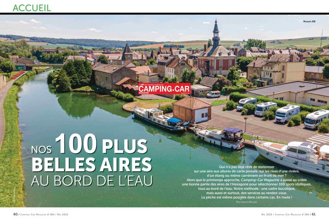 Avec ce numéro qui arrive avec le printemps et les beaux jours, la rédaction a souhaité introduire une touche de plaisir pour profiter de la nature et de la vie en plein air. Le dossier des 100 plus belles aires au bord de l’eau rassemble ainsi des espaces de stationnement aux allures de cartes postales, sur les rives de rivières, de lacs ou de l’océan. Situés aux quatre coins de l’Hexagone, ces spots rassemblent aussi tous les services nécessaires et parfois de quoi pêcher.