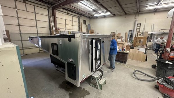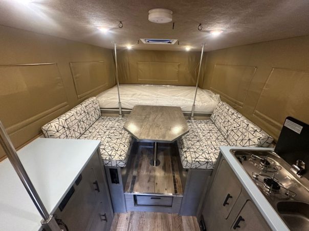 À l’intérieur, on retrouve une cuisine complète, un réfrigérateur, un chauffe-eau, une douche et une chambre. Celle-ci peut accueillir jusqu’à quatre personnes. Pour alimenter les équipements à bord, l’aménageur a installé un panneau solaire et une batterie au lithium de 400 Ah.
