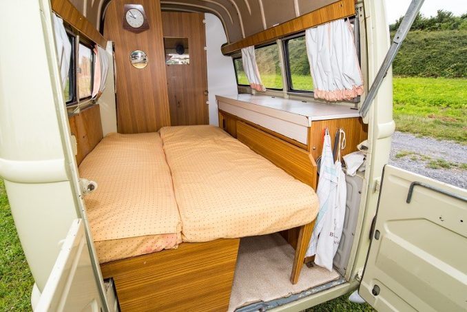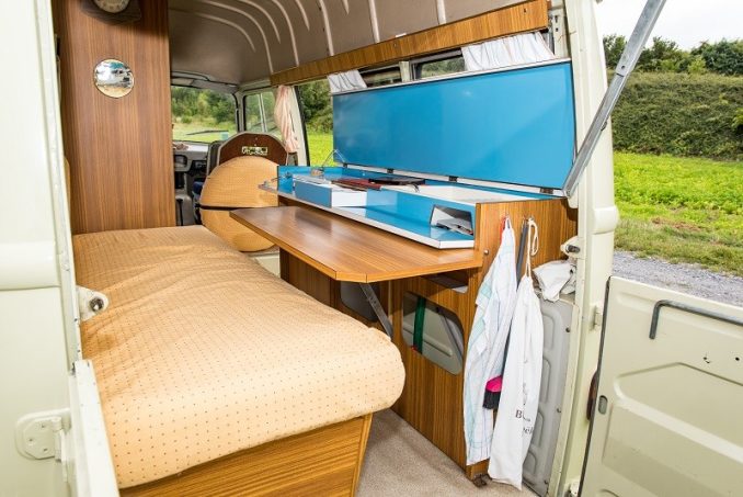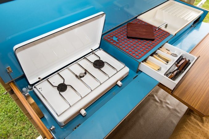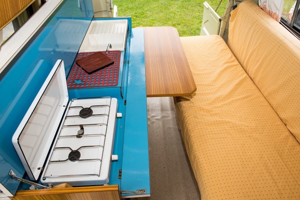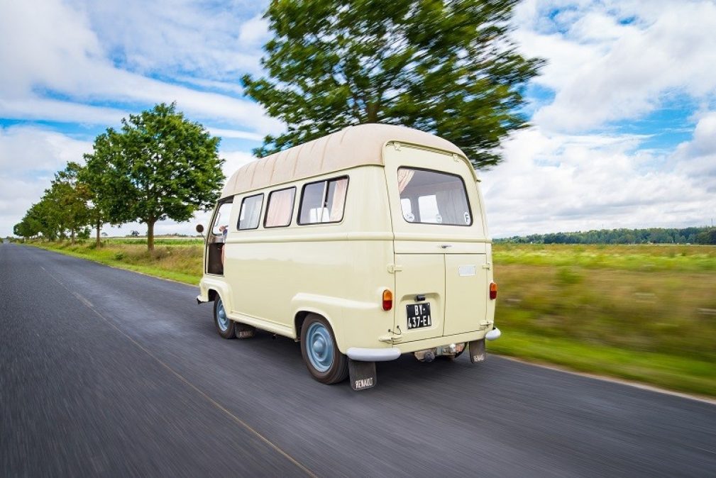 Pour revenir à notre Star du jour, il s’agit d’un kit d’ameublement à installer soi-même dans son Estafette (ou à faire poser par son concessionnaire). Démontable en une quinzaine de minutes selon la documentation de l’époque, il permet de transformer son utilitaire ou son minibus en fourgon aménagé, et inversement, en un tournemain. L’ensemble comprend une grande penderie derrière le conducteur, dont la porte en deux parties permet d’occulter complètement la cabine de conduite pour la nuit, une banquette convertible en lit pour deux dans le prolongement, des rideaux, un bloc cuisine côté passager comprenant une table rabattable avec réchaud deux feux (signé Star !), tiroir à couverts et évier avec paillasse, ainsi qu’une pompe à pied pour alimenter le robinet ! Un ensemble facturé 2 500 F (environ 3 300 €), quand l’Estafette elle-même valait 7 500 F HT (un peu moins de 10 000 €). Dans les versions rallongées dites “1 000 kg”, il était possible, comble du luxe, d’ajouter un réfrigérateur et une commode à trois tiroirs. Notre Star étant une “800 kg” rehaussée, un modèle de 1968 à calandre “grillage” mais disposant du moteur de la Renault 8, elle ne profite pas de ces derniers raffinements. Elle n’en reste pas moins une exceptionnelle deuxième main, qui affichait quelque 30 000 kilomètres seulement lorsque ses actuels propriétaires l’ont achetée. Depuis, elle fait leur plus grande fierté lors de sorties entre rétro-campeurs ou, tout simplement, lors d’escapades en couple, sous le regard nostalgico-amusé de ceux qui ont connu l’Estafette ou étonné des autres, mais toujours bienveillant.