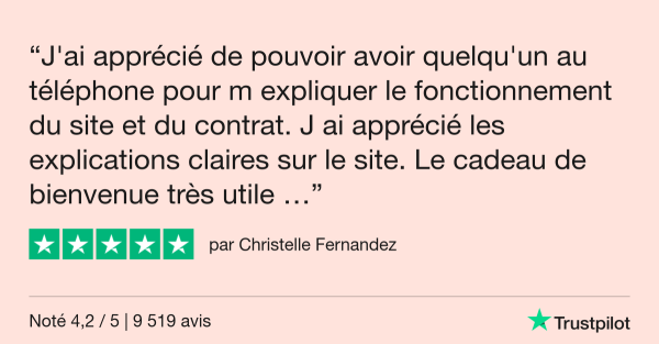 Christelle F., 5/5 : “J'ai apprécié de pouvoir avoir quelqu'un au téléphone pour m’expliquer le fonctionnement du site et du contrat. J’ai apprécié les explications claires sur le site. Le cadeau de bienvenue très utile.”