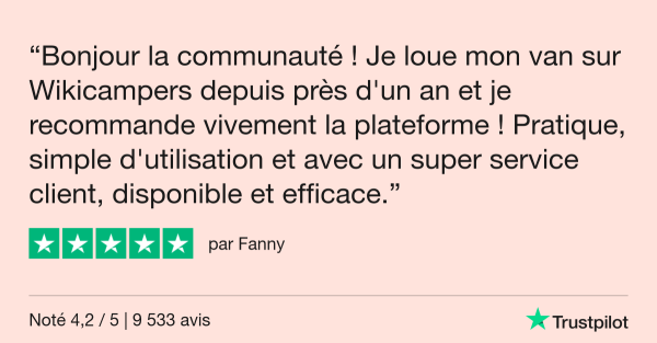 Fanny, 5/5 : “Bonjour la communauté ! Je loue mon van sur Wikicampers depuis près d'un an et je recommande vivement la plateforme ! Pratique, simple d'utilisation et avec un super service client, disponible et efficace.”