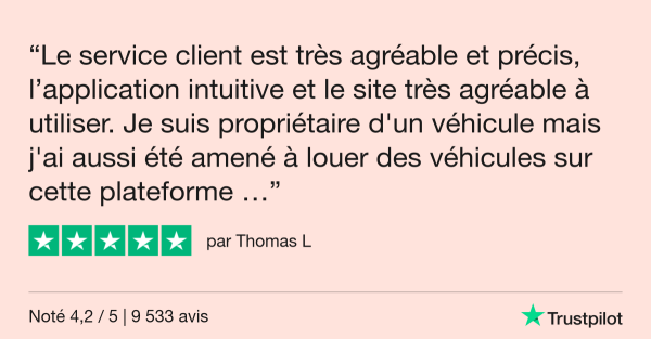 Thomas L;, 5/5 : “Le service client est très agréable et précis, l’application intuitive et le site très agréable à utiliser. Je suis propriétaire d'un véhicule, mais j'ai aussi été amené à louer des véhicules sur cette plateforme. Thomas”