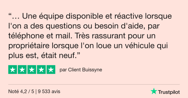 x, 5/5 : “Plate-forme très complète, à la fois pour la mise en ligne de l'annonce, comme pour la gestion des départs et retours de la location. Une équipe disponible et réactive lorsque l'on a des questions ou besoin d'aide, par téléphone et mail. Très rassurant pour un propriétaire lorsque l'on loue un véhicule qui plus est, était neuf.”