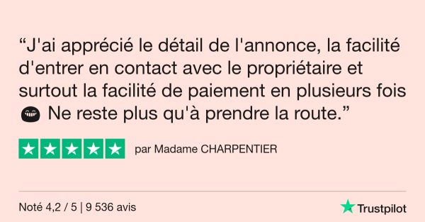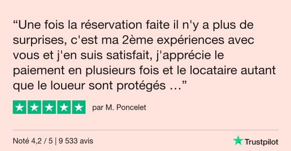 M. Poncelet : “Une fois la réservation faite il n'y a plus de surprises, c'est ma 2ème expériences avec vous et j'en suis satisfait, j'apprécie le paiement en plusieurs fois et le locataire autant que le loueur sont protégés. Bonne continuation !”