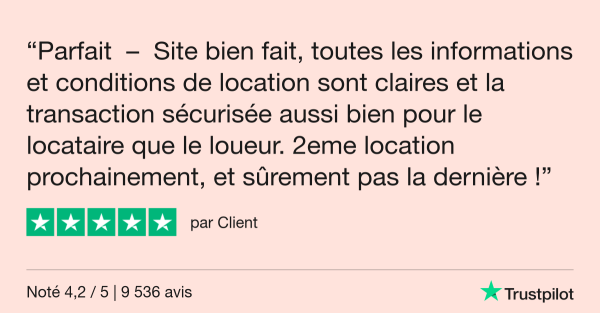 Hervé S., note 5/5 : "Site bien fait, toutes les informations et conditions de location sont claires et la transaction sécurisée aussi bien pour le locataire que le loueur. 2ᵉ location prochainement, et sûrement pas la dernière !"