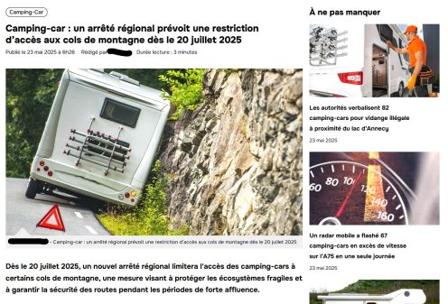 Un site en particulier publie des articles évoquant la verbalisation massive de camping-cars dans des communes françaises ou des territoires protégés. D'autres sujets évoquent la soi-disant mauvaise santé économique du secteur du VDL, les camping-caristes faisant le choix de revendre leur véhicule, inondant le marché de l'occasion.