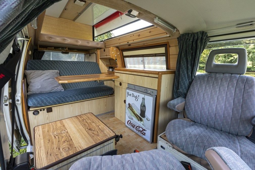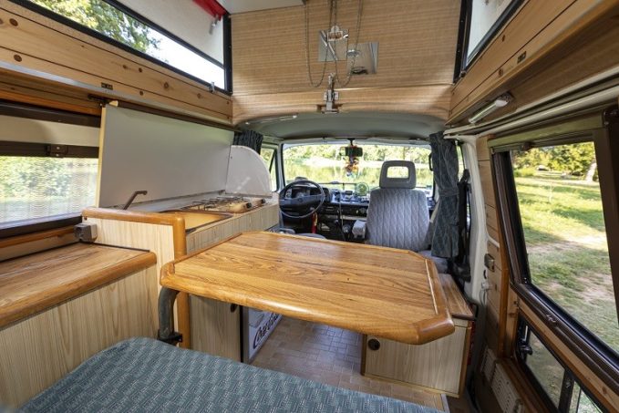 Retour de nos jours. Dans son magnifique Auto Camp de 1990, Manu est à la manœuvre. De l’extérieur, le ballet est amusant : le toit se soulève d’un bloc, dans un mouvement qui le déporte vers l’arrière, avant que les parois, qui se fixent horizontalement sous le pavillon lorsque ce dernier est fermé, ne s’abaissent. Ou pas, puisqu’il est tout à fait possible de s’en passer à ce moment-là. Un détail qui amuse beaucoup les voisins de bivouac lorsque, le matin, l’épouse de Manu ouvre une paroi pour jeter un œil à l’extérieur. Des moustiquaires sont également de la partie, au cas où. La hauteur intérieure ainsi dégagée dépasse les 2 mètres et, pour la nuit, il est possible d’y installer un lit. Ce dernier est constitué de trois panneaux de bois – remisés au-dessus de la banquette lorsque le toit est baissé – et de coussins. On ne peut pas dire que le tirant d’air est impressionnant, mais cela fait tout de même quatre couchages au total, et les enfants doivent adorer cette petite cabane. Au rez-de-chaussée, l’affaire est plus attendue. Difficile, dans un véhicule de 4,57 m, de faire preuve d’ingéniosité. Banquette face route, meuble cuisine et rangement courant côté gauche, on ne risque pas de se perdre. Pour autant, le volume total de rangements est assez impressionnant. Quelques astuces méritent d’être évoquées, comme l’espace permettant de ranger des skis de 2 mètres, le coffre, derrière le siège passager, abritant un bloc WC portatif ou encore la table, disposant de deux points d’ancrage au sol. Si l’Auto Camp n’innove pas, il optimise.