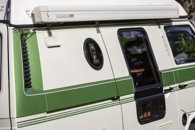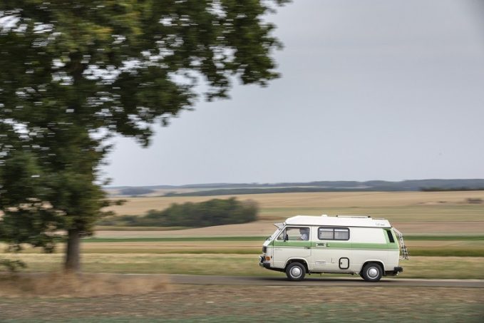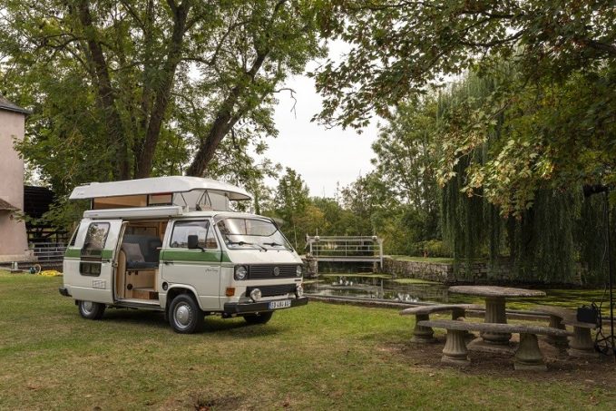 Difficile de résister à la bouille mi-joviale, mi-renfrognée du Volkswagen T3. Plus encore quand il se pare, comme ici, des attributs Font Vendôme d’époque : grande baie en deux parties sur la porte coulissante, hublot rond quelques décimètres en arrière, bandes vertes et, surtout, ce toit relevable à nul autre pareil. Avec un tel équipage, ne l’appelez plus Transporter ou Combi, mais Auto Camp. Est-il besoin d’expliquer la contraction ? Dans la positive, comprenez alors “une automobile pour le camping”. Pour en revenir à ce couvre-chef si particulier, il est l’œuvre de la petite équipe Font Vendôme 2000, marque fondée par Claude Martinot. Mécanicien de son état, il avait quitté la Région parisienne où il officiait, afin d’aménager des vans et fourgons dans sa région périgourdine natale, à Brantôme. Plus exactement dans le lieu-dit de… Font Vendôme. Lorsque le Bellevue Horizon, petit nom du toit susmentionné, sort en 1980, l’entreprise n’a que deux ans. Et la genèse de celui-ci aurait duré le temps d’un week-end… S’il n’est pas le premier toit relevable à parois rigide, il est alors le seul à bénéficier d’une isolation : 4 cm de polyuréthane pour le pavillon et 2 cm pour les parois. La société se faisait fort de poser l’équipement dans la journée pour des clients ne désirant pas forcément d’aménagement, comme le revendiquaient les publicités de l’époque.
