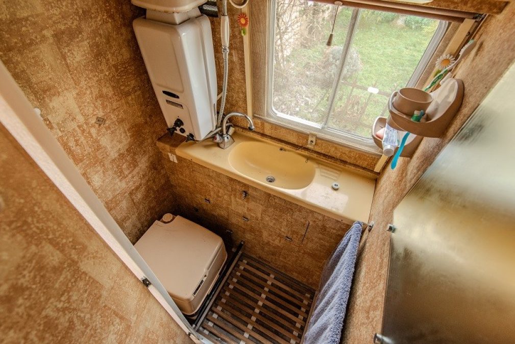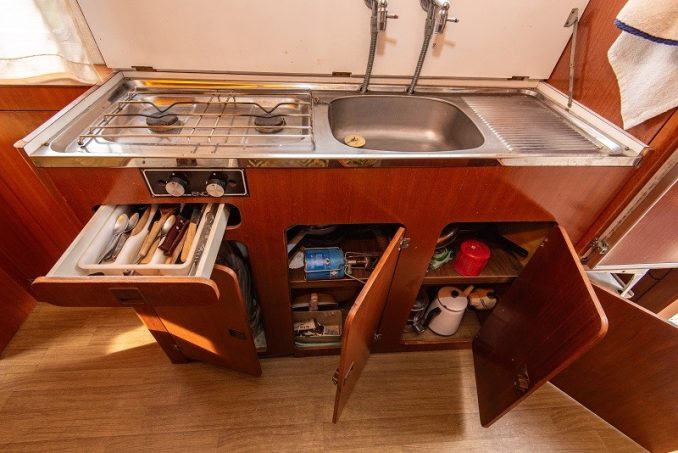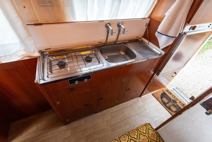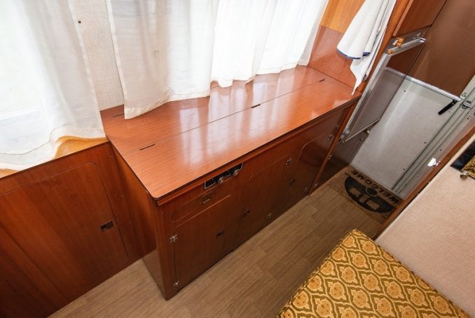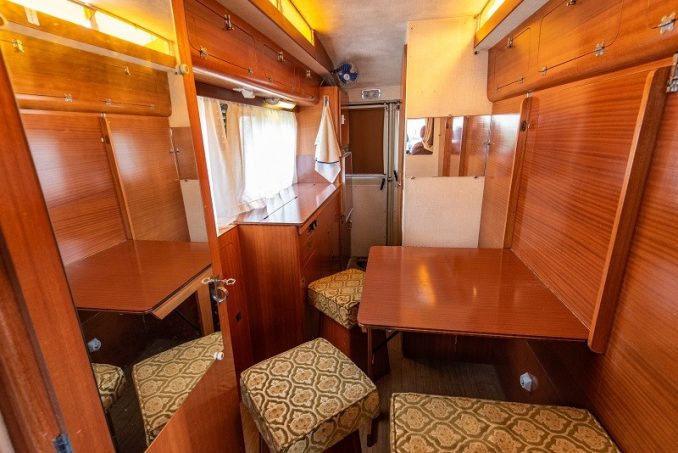 L’absence de porte latérale coulissante impose de pénétrer à bord par l’arrière, ou bien par le poste de conduite au prix de quelques contorsions. Le mobilier est installé en enfilade sur toute la longueur de la cellule habitable avec, côté droit à partir de l’arrière, un meuble haut incluant le réfrigérateur, la cuisine avec un grand ensemble réchaud/évier/paillasse en Inox caché sous un rabat sur lequel sont fixés les deux robinets et, après un dégagement, une penderie. En rebroussant chemin, côté conducteur, on trouve deux fauteuils fixes accompagnés de deux tabourets nomades et, à l’extrême arrière, une belle surprise avec une salle d’eau tout confort : lavabo, douche et toilettes portables. Sans oublier la présence presque incongrue d’un chauffe-eau qui n’aurait pas déparé au-dessus de l’évier de nos arrière-grand-mères ! Et le couchage, demanderez-vous ? Eh bien, il se trouve rangé contre la paroi gauche et se rabat simplement le soir venu. Tout comme la table qui, elle, est calée, avec ses pieds repliables, sous le sommier. Le tout est complété par des placards de pavillon de chaque côté. Les boiseries façon cerisier et quelques détails comme le plafonnier central, la sellerie brodée, les nombreux miroirs ou encore l’horloge intégrée, donnent un petit air moderniste à l’ensemble que la lumière chaude due aux fenestrons orangés du lanterneau caractéristique réchauffe encore. Ce dernier permet, malgré la hauteur limitée, de se tenir debout à bord.