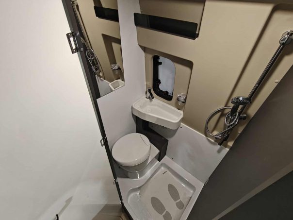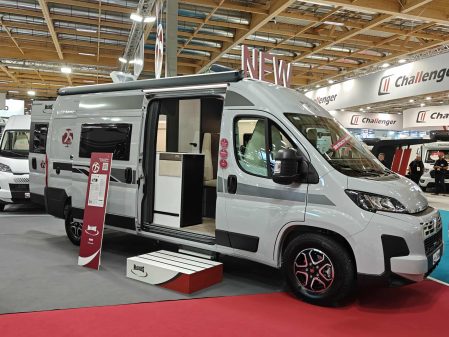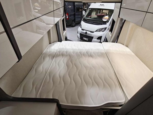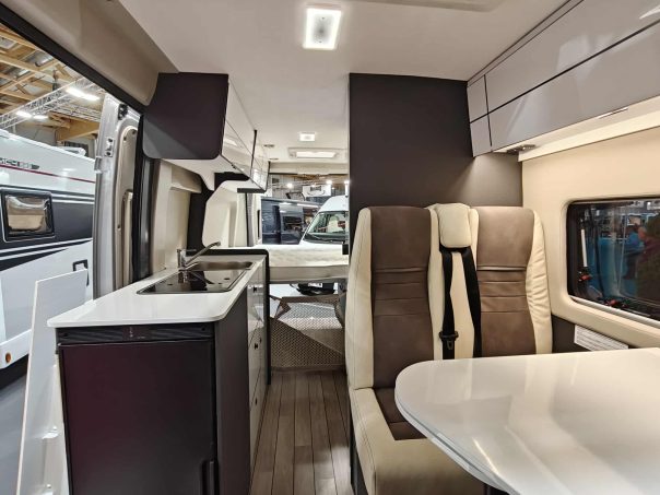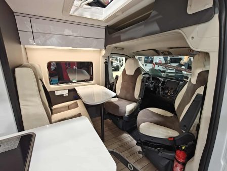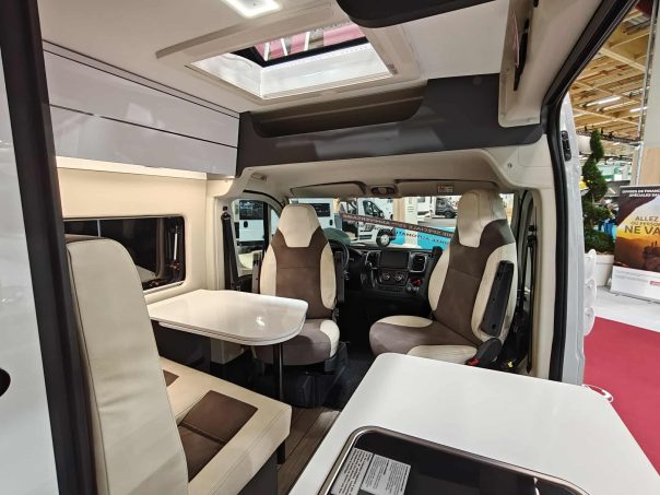 Le confort s’invite aussi dans l’espace de vie avec un lanterneau panoramique, une moustiquaire de porte latérale, un marchepied électrique, des stores plissés cabine, un panneau solaire de 200 W, un store extérieur et un bandeau LED extérieur. Il est commercialisé 59 990 €.