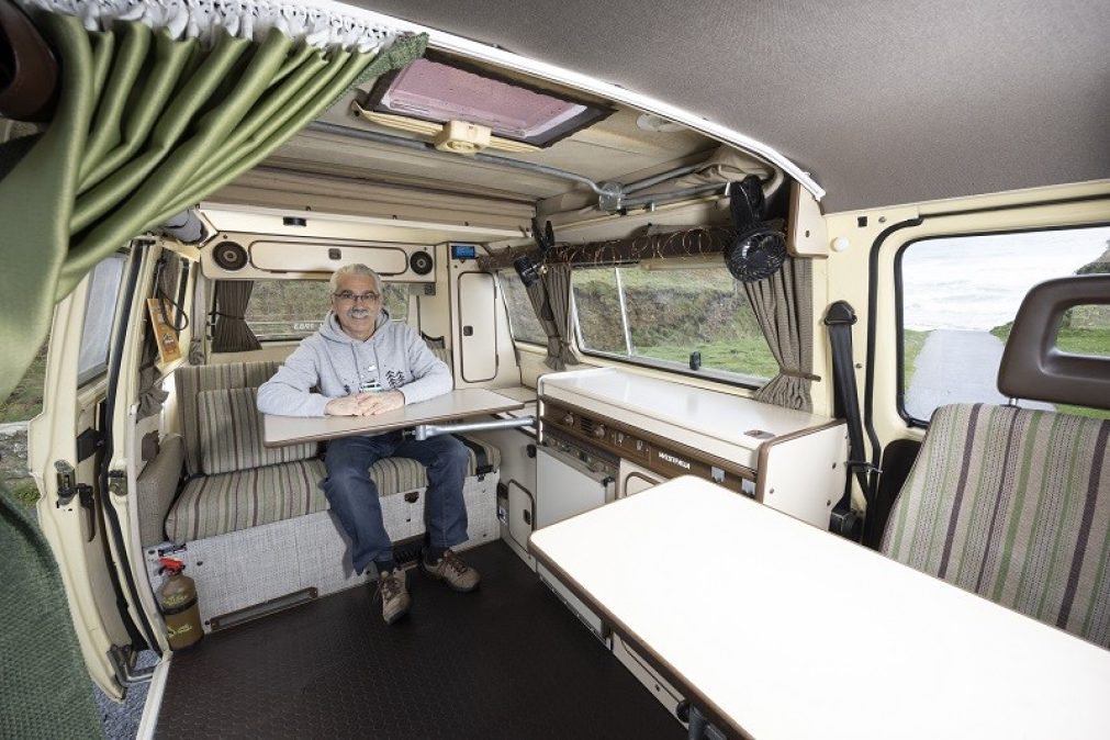 Notre exemplaire du jour, un Joker 1, date de 1983 et profite, dans le jargon VW fan, d’un watercooled, c’est-à-dire qu’il est à refroidissement liquide (celui à air a définitivement disparu l’année précédente). Il s’agit d’un 1.9 essence à carburateur de 78 ch, disposant toujours ses quatre cylindres à plat (sur le T3, seuls les diesels étaient des 4-cylindres en ligne). L’aménagement reste typique des réalisations Westfalia avec un meuble comprenant la cuisine et les rangements côté gauche, ainsi qu’une banquette qu’il suffit de déplier pour la transformer en couchage avec l’aide d’un complément de matelas installé au-dessus du moteur. Le toit pop-up cache un lit dépliable. Il convient toutefois de souligner les quelques astuces bien pensées, comme la table principale se réfugiant contre la paroi pour la route ou le deuxième salon constitué des sièges de cabine pivotants (à seulement 90° pour celui du conducteur) et d’une autre table, plus petite. Vendu neuf en France par la concession Samco Créteil, comme en témoigne la plaque de distributeur apposée à l’arrière, certaines spécificités de ce Joker interpellent. Les pare-chocs américains et la boîte automatique trois vitesses sont en effet d’origine, et Alain a découvert que le T3 qui a servi de base a été assemblé au Brésil, sans doute destiné au marché états-unien au départ. Comment est-il arrivé dans l’Hexagone ? Le mystère reste entier. Ce qui est clair, en revanche, c’est son passé limpide que confirme son bel état de préservation tant intérieur qu’extérieur. Un modèle de cinquième main, mais un dossier de factures complet. Alain a joué la sécurité après une première expérience amère. Ce fana de voitures américaines (son Westfalia dort en compagnie d’une Ford Mustang et d’un Plymouth Barracuda…) et amateur de camping depuis belle lurette désirait un petit véhicule à la croisée du campervan et de la collection pour une utilisation vraiment loisirs. Et avec son épouse Anne, ils en ont déjà bien profité, depuis un peu plus d’un an : rassemblements, vacances, dont un grand périple en Espagne notamment dans les Bardenas Reales… Ils n’hésitent jamais à prendre le large, à bord de leur magnifique Joker.