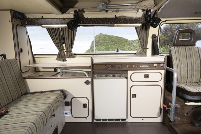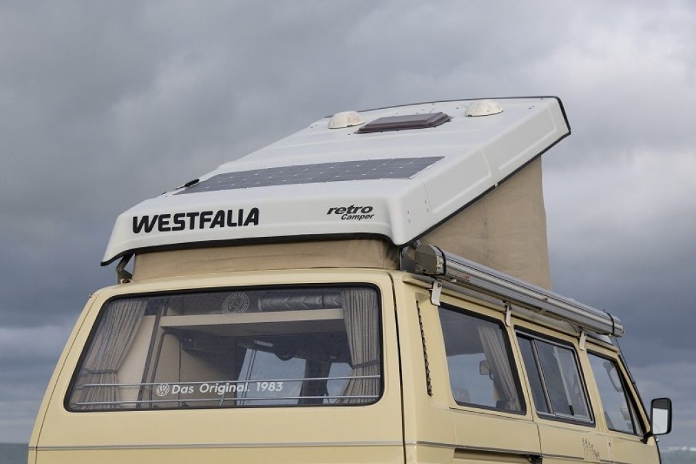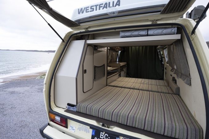 Trente ans plus tard, en 1978 plus précisément, le T3 entre dans la danse. Plus moderne dans ses lignes (d’aucuns diront moins joli), il conserve cependant l’architecture à moteur en porte-à-faux arrière et des blocs quatre-à-plat refroidis par air, des technologies alors désuètes. Westfalia dévoile son Joker cette même année. Ou plutôt ses Joker puisque la gamme ne comporte pas moins de six déclinaisons numérotées de 1 à 6. Pour faire simple, tous reposent sur deux implantations typiques de Westfalia : meuble cuisine et rangement côté gauche et banquette transformable – la capacité de passagers de cette dernière différenciant les versions impaires (deux places) et paires (trois places). Les Joker 1 et 2 disposent d’un toit relevable, les 3 et 4 d’une rehausse fixe et les 5 et 6 reçoivent un toit pop-up avec excroissance sur l’arrière permettant ainsi de laisser, sur le lit haut, draps, couvertures et oreillers.