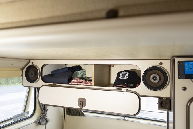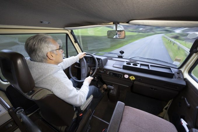 Avec ses airs de gros jouet, “notre” Joker ne passe pas inaperçu dans la circulation cherbourgeoise. Sa couleur crème apporte un peu de gaieté à cette morose journée d’hiver, où les carrosseries brillent par la tristesse de leurs gris plus ou moins foncés. Les regards se tintent d’une petite étincelle et quelques pouces se lèvent au passage de l’équipage. Mais la majorité n’imagine pas les atouts cachés de ce mini-camper signé Westfalia. L’histoire entre Volkwagen et l’aménageur est celle de deux destins croisés puisque la seconde n’existerait pas, sous la forme qu’on lui connaît, sans la naissance de la première. Quand la “voiture du peuple”, débarrassée de son encombrant commanditaire, commence à construire sa fameuse Coccinelle, la nécessité d’un utilitaire dans l’embryon de gamme ne tarde pas à se faire sentir. Ce sera le Type 2 T1 (la Coccinelle étant le Type 1). Nous sommes en 1950 et il ne faudra qu’un an à Westfalia pour développer, à la demande d’un officier britannique basé en Allemagne, une version camper. Dès lors, le succès est au rendez-vous et Westfalia devient quasiment un nom commun avec le temps.