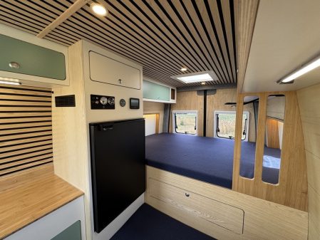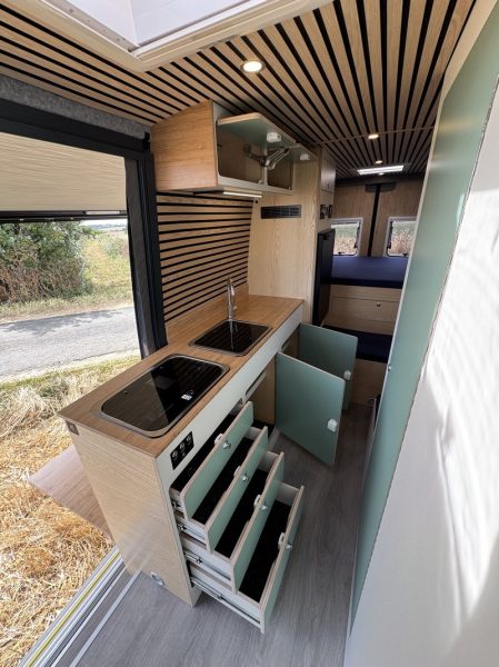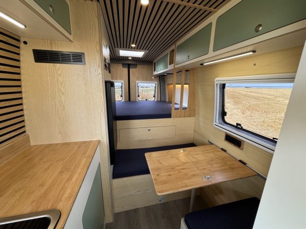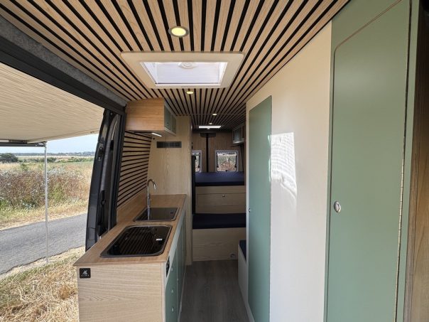 Pour ce modèle, l'aménageur de la Rochelle a eu recours à des extensions de carrosserie dans les parois permettant ainsi de profiter d’un lit transversal double de bonnes dimensions et reposant sur une grande soute garage. Ce couchage est précédé d’une banquette servant à la dînette face/face. Elle s'accompagne d'une table coulissante sur rail extensible. Dans ce véhicule de presque 7 m de longueur, les "clients" ont souhaité profiter d'une très grande cuisine. Conséquence, cet Almo loge un meuble de 1,60 m sur lequel on retrouve une plaque de cuisson avec 2 feux gaz, un évier et surtout de nombreux tiroirs et placards sans oublier la colonne de rangement intégrant le réfrigérateur de 130 l.