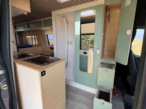 La salle d'eau bénéficie d'un compartiment à part, totalement isolée. Almo intègre donc un WC fixe, un lavabo et une douche avec rideau disposant d'un receveur de 70 x 70 cm sans oublier un miroir de plein pied sur la porte d'accès. Derrière le siège conducteur, Almo a inséré une penderie et tiroirs pour offrir encore plus de rangements. Côté autonomie, Almo a opté pour une installation électrique Victron Energy avec batterie Lithium 150 Ah et panneau solaire de 220 W.