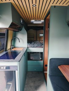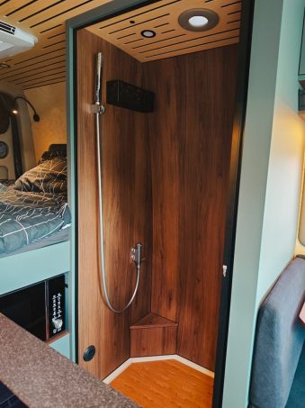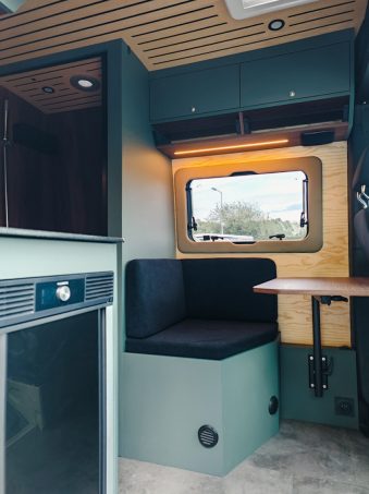 L’implantation est assez classique pour un Mercedes Sprinter, elle inclut une banquette face route, un bloc cuisine avec des composants 100% électriques, une salle d’eau sans lavabo et un lit transversal. Notons que le véhicule embarque des toilettes sèches.