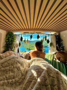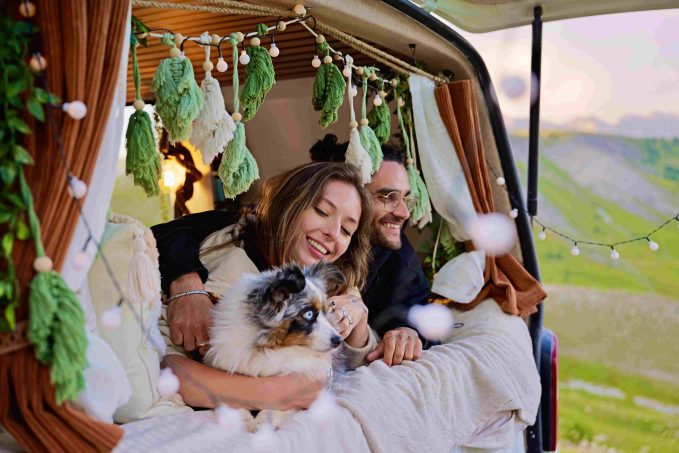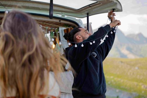 Finalement, à la faveur d’un ras-le-bol général, les choses se décantent : « Ça n’allait pas trop dans notre vie, se remémore Gianni. A ce moment, Chloé était professeur d’art plastique dans un collège. « Je ne dessinais plus, je ne faisais plus rien d’artistique, tout ce qui me passionnait. J’ai vraiment senti que ça ne me plaisait pas, que ce n’était pas ma place. Depuis, je me suis reconvertit dans le tatouage un peu par hasard, et j’adore ça ! ». Gianni, développeur informatique, se morfondait à longueur de journée devant ses écrans. « On regardait régulièrement les petites annonces de van et on en a vu passer un qui nous convenait. On a craqué, on l’a acheté sur un coup de tête ». C’était en octobre 2023. Neuf mois plus tard, l’aménagement de leur Volkswagen T4, baptisé Pumpy, fini, ils profitent de leur maison sur roues. « On est partis quelques weekends avec et on a vite été médiatisés, parce que l‘aménagement est chaleureux. Il avait quelque chose de plus. On a été contactés par la télé, des festivals nous ont proposé d’être exposants. On découvrait la vanlife, mais pas seulement côte spots. On la découvrait coté communauté, c’est surtout ça qui nous a marqué. Pendant tout l’été en Camargue, dans les Alpes… On adorait, ça nous permettait de rencontrer du monde alors qu’on est un peu timide ». Et c’est cette timidité qui a poussé nos jeunes nomades à développer leur application Vagano