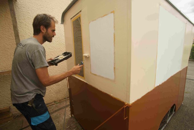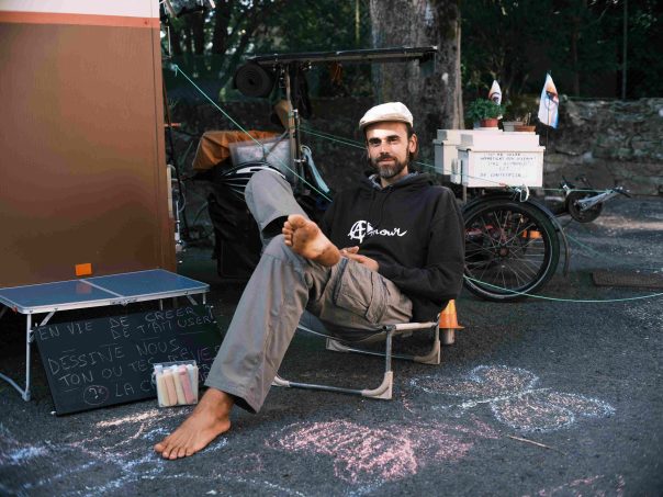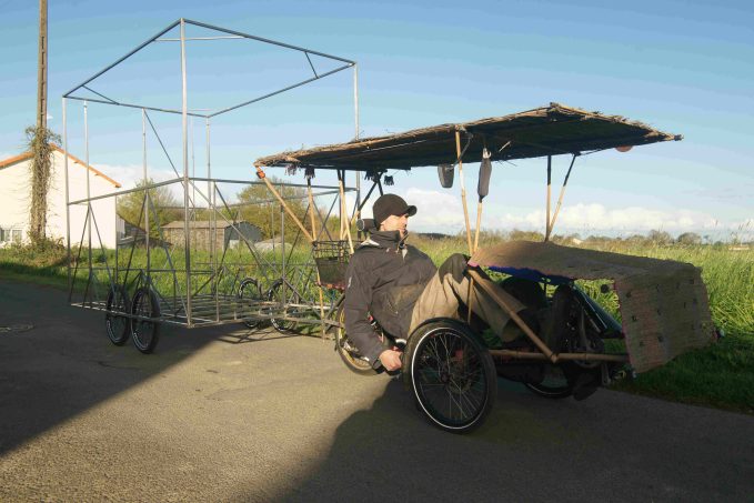 À 39 ans, cet Angevin d’origine a exercé de nombreux emplois, barman, boulanger, serveur, conducteur de poids lourds, commercial, manager dans la restauration rapide… Ce parcours varié l’amène à repenser son mode de vie, afin de réduire ses besoins financiers. Il imagine alors une solution radicale : enlever le moteur du camping-car. « J’ai voulu conserver un maximum de confort dans un grand espace, comme une roulotte, mais avec un vélo à la place du cheval », résume-t-il.
