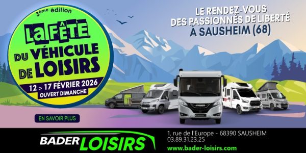 La 3e édition de La Fête du Véhicule de Loisirs 2026 s’invite chez Bader Loisirs du 12 au 17 février 2026. Cet événement dédié aux camping-cars, vans et fourgons aménagés s’adresse à tous ceux qui souhaitent découvrir, comparer et concrétiser leur projet de véhicule de loisirs. Durant six jours, les visiteurs pourront découvrir 60 modèles exposés : camping-cars profilés, intégraux, vans aménagés et fourgons...