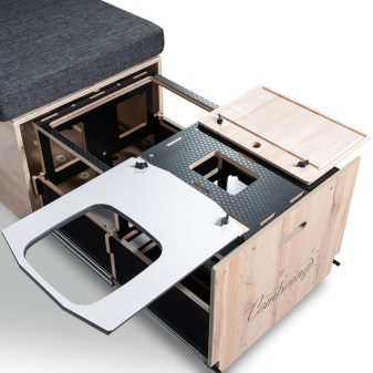 Grâce au configurateur, l’aménagement est personnalisable, tant dans les couleurs, que les vernis, les accessoires et les planchers. « L’installation est très rapide, alors que lorsque les clients viennent dans nos locaux, on installe un kit dans leur véhicule et ils peuvent se projeter », ajoute le dirigeant. Le plancher peut être vissé au sol du véhicule, mais ce n’est pas obligatoire. Ensuite, les caissons sont calés avec des vis papillons.