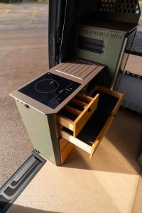 Aujourd’hui, tous les meubles sont réalisés avec ce procédé, complété par des façades en bois. L’aluminium est ensuite peint en thermolaquage. Une solution qui permet de gagner en légèreté, tout en conservant robustesse et durabilité, un critère essentiel sur un fourgon 4x4 destiné au voyage. L’entreprise revendique d’ailleurs être la seule en Europe à utiliser ce procédé de structure en aluminium à cette échelle.