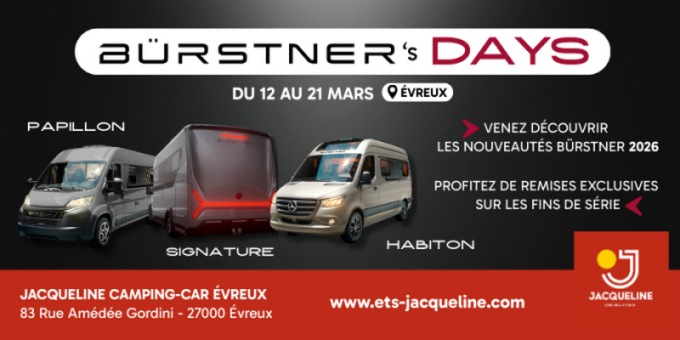 De son côté, Jacqueline Camping-car organisent deux évènements majeurs dans les concessions d'Evreux et de Caen. En effet, à Evreux se tient les Bürstner Days jusqu'au 21 mars pour découvrir les modèles de la marque allemande et profiter d’offres spéciales durant plusieurs jours. À Caen, ce sont les Instants Road Trip – spécial vans et fourgons qui se déroulent jusqu’au 21 mars.